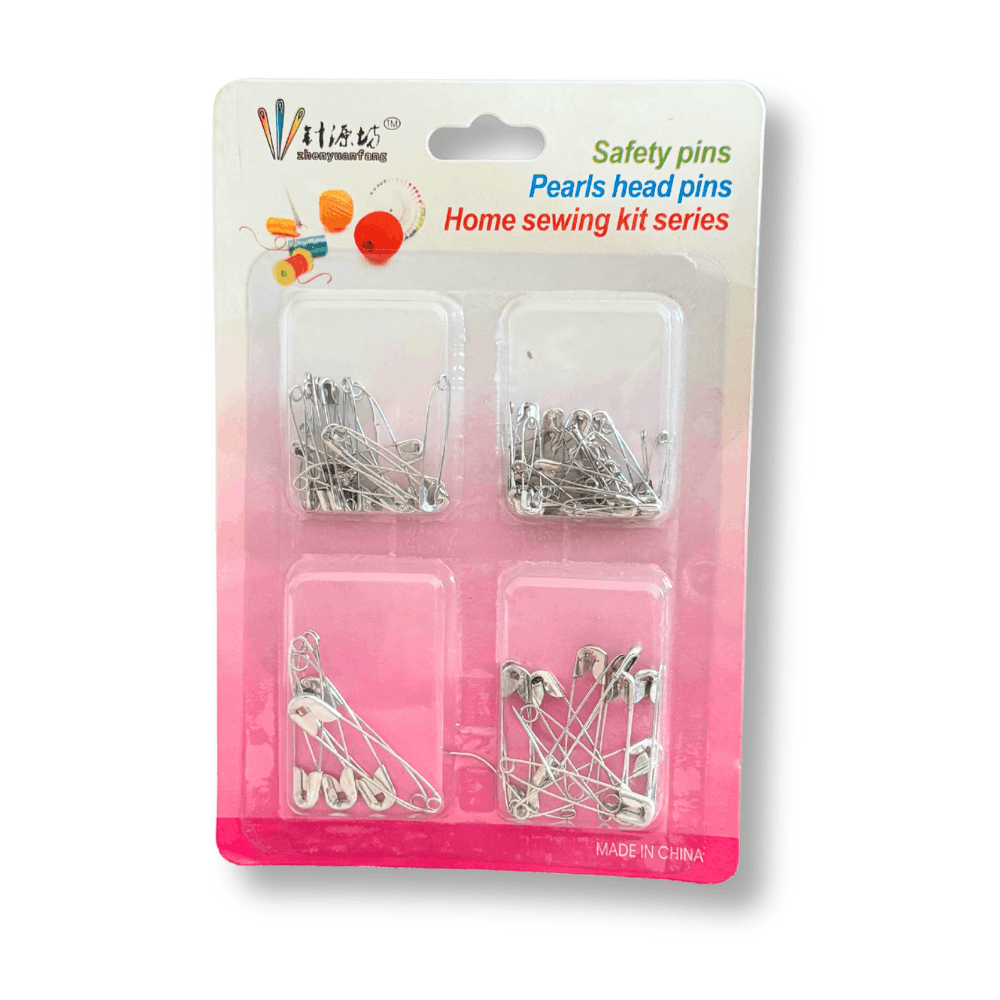 Універсальний набір англійських шпильок із серії Home sewing kit для дому. У блістері розміщено 4 комплекти шпильок сріблястого кольору. Виготовлені з надійної сталі, що пружинить і не деформується. Гостре вістря легко проколює щільну тканину, а класичний замок міцно фіксує краї. Незамінні для ремонту одягу, рукоділля та господарства. Безпечні, гострі та довговічні.